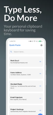Our app lets you create and save a library of text templates, so you can paste frequent replies, emails, addresses, or any other text with a single tap. Forget the hassle of switching apps to copy and paste—Quick Paste makes it instant.